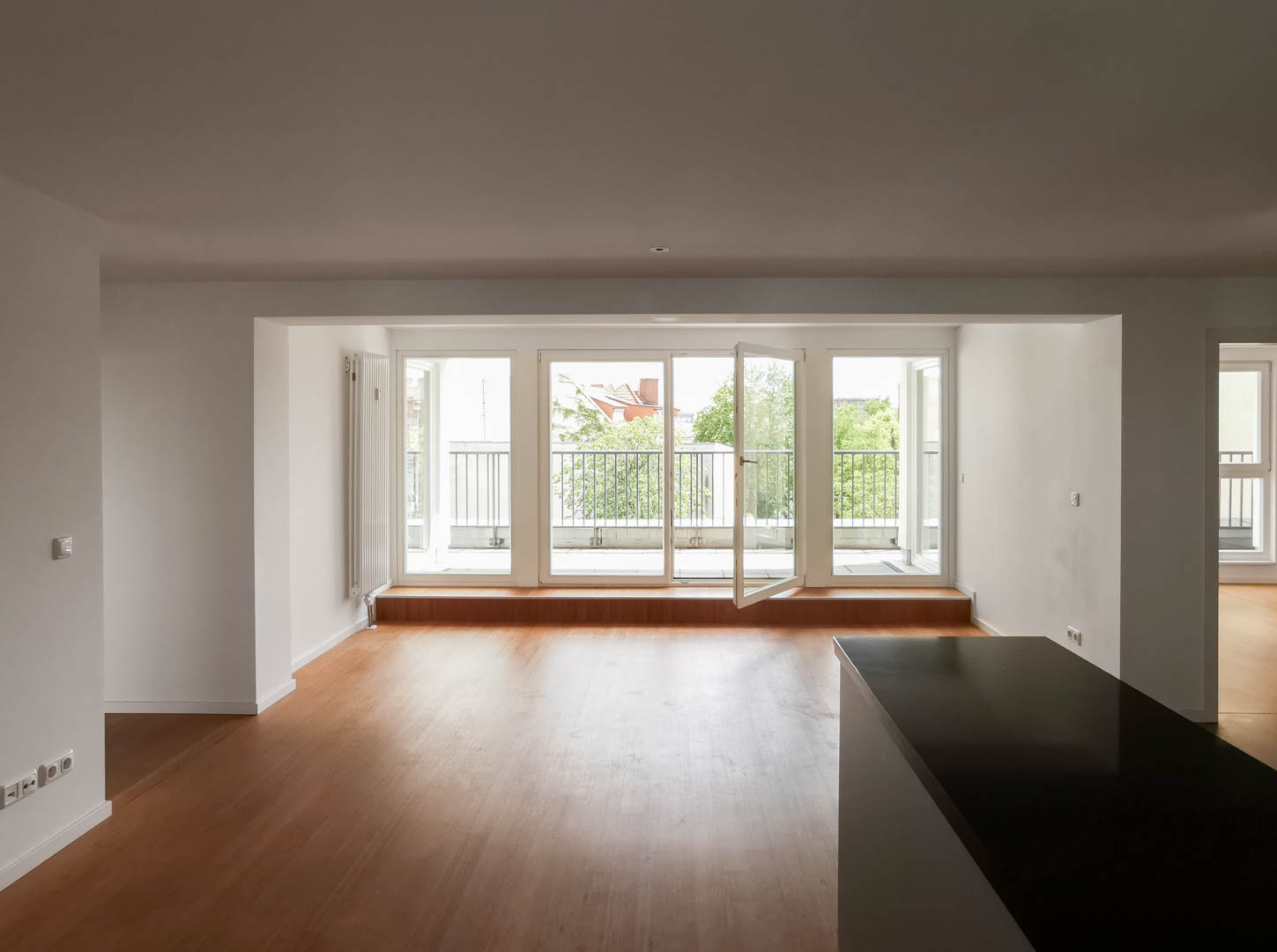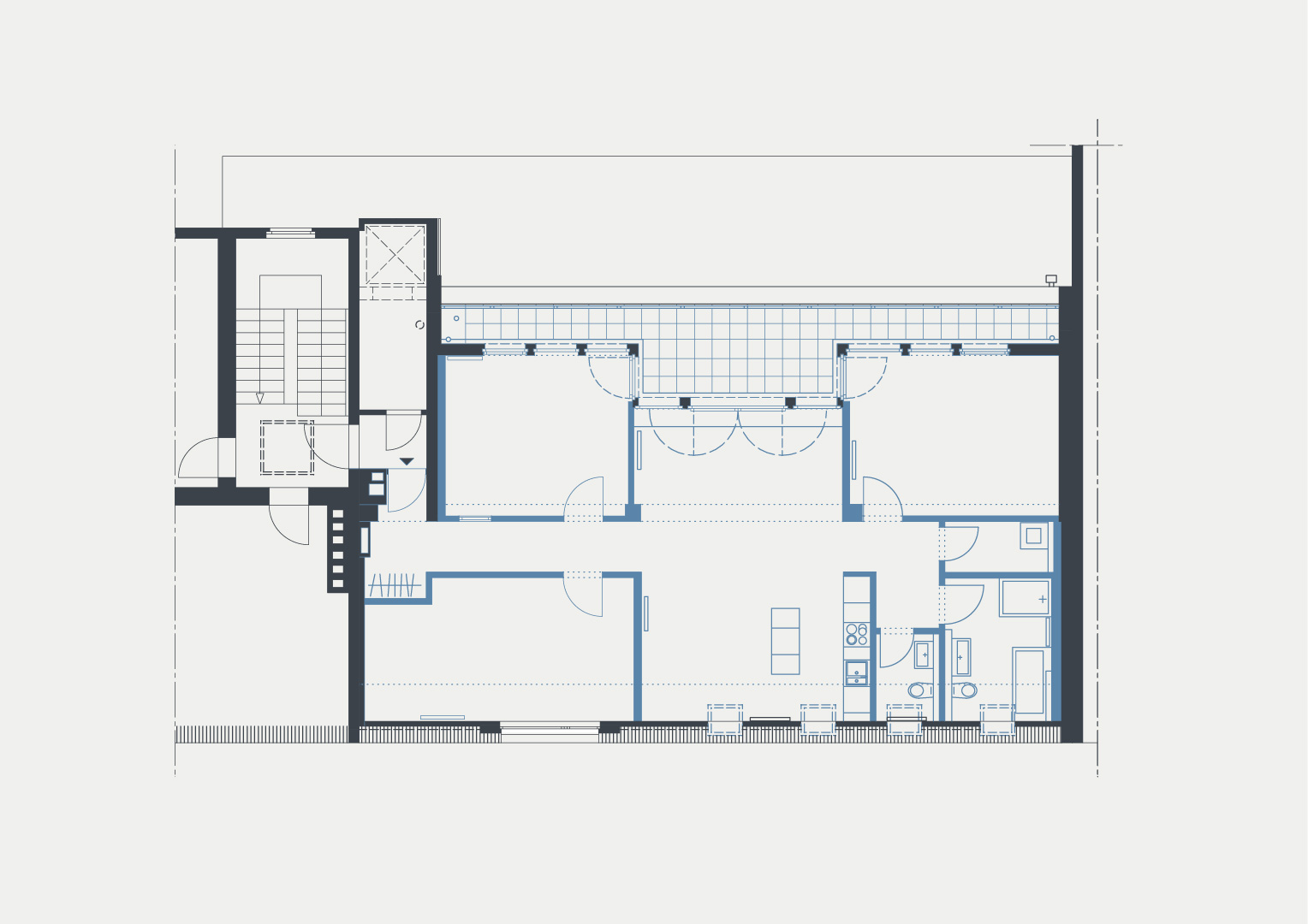 Es entsteht eine Wohnung mit 4 Räumen, Bad, WC und Küche. Der hofseitige Neubau ist als gedämmte Holzständerfassade geplant. Die sonnige, ruhige Hofseite wird mit raumhohen Verglasungen versehen. Der Küchenraum der Wohnung wird von beiden Seiten belichtet. Es erfolgte eine vollständige Neuinstallation der Elektro- und Sanitär- und Heizungsausstattung. Der gesamte Umbau wird nach der aktuellen EnEV ausgeführt.