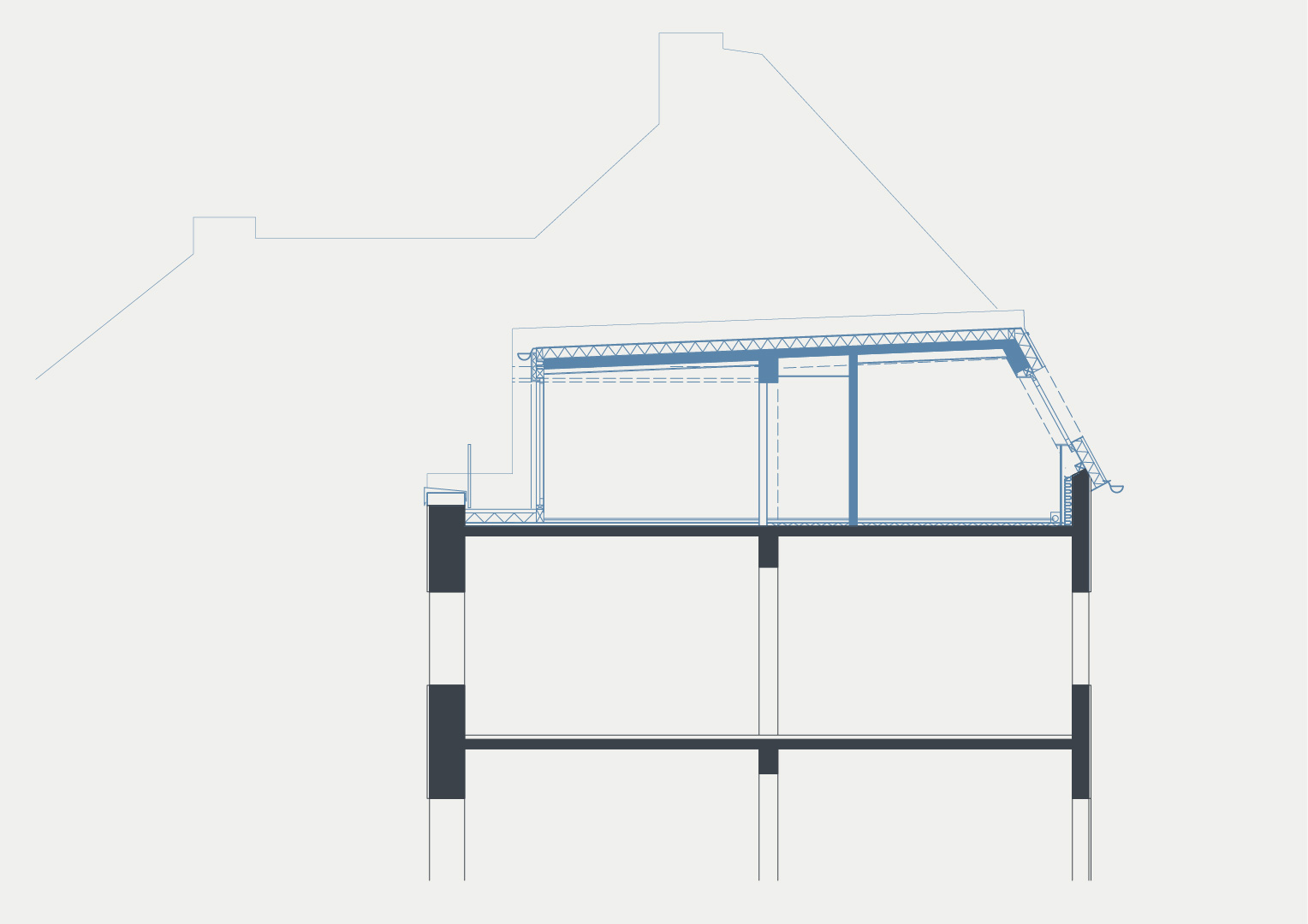 Das bestehende Objekt setzt sich aus zwei nebeneinanderstehenden Gebäuden zusammen, die für Wohn- und Geschäftszwecke genutzt werden. Dem Gebäude von 1935 wurde 1969 ein Stahlbetonskelettbau nebengestellt. Im Zuge der geplanten Baumaßnahme soll das Dachgeschoss des 69er-Gebäudes zu Wohnzwecken ausgebaut werden. Hofseitig ist ein Neubau mit durchgängiger Terrassenfläche und straßenseitig der Ausbau des vorhandenen Dachgeschosses geplant.